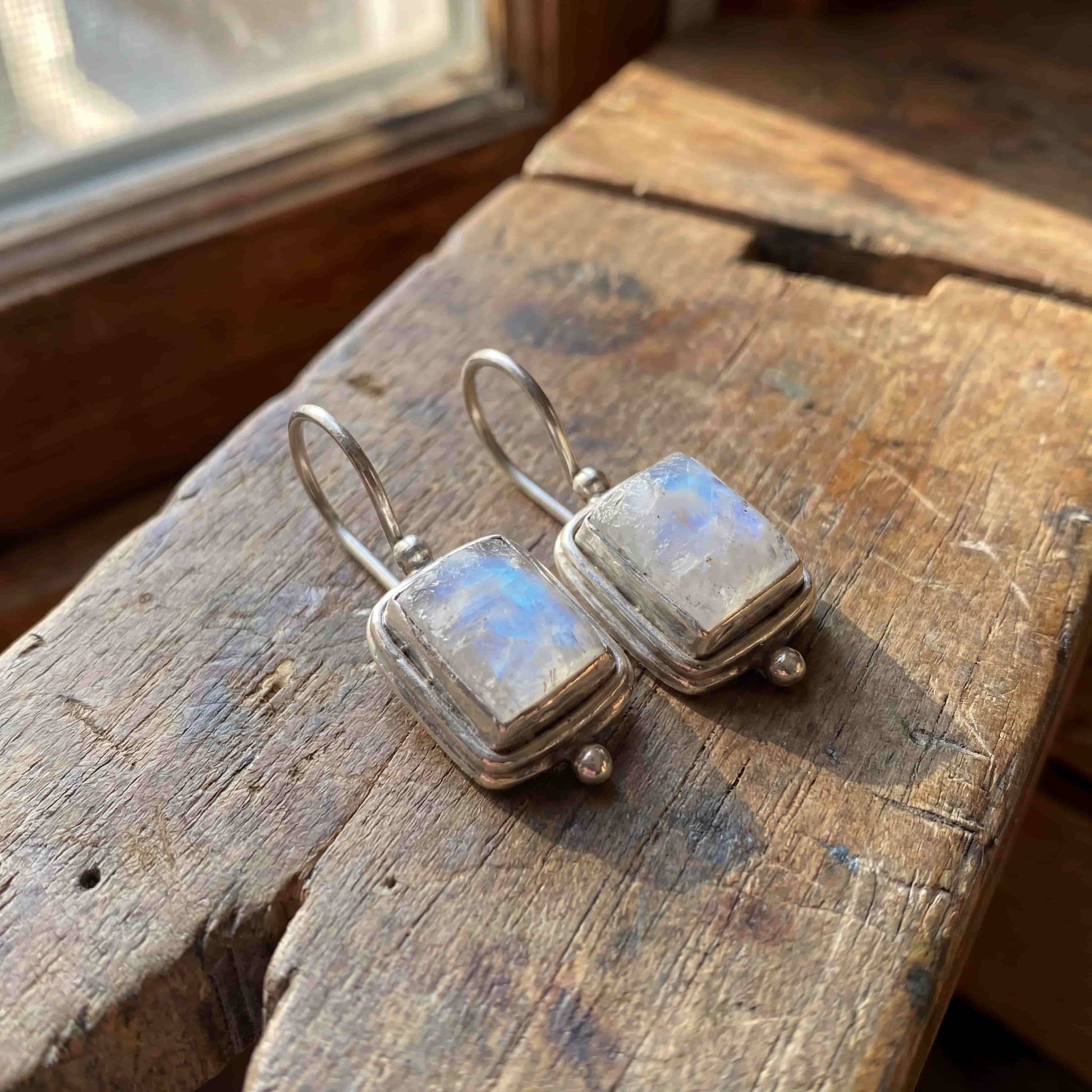 Sølvøreringe med rå månesten i firkantede fatninger. Mellemstore og markante med en levende blå glød.
