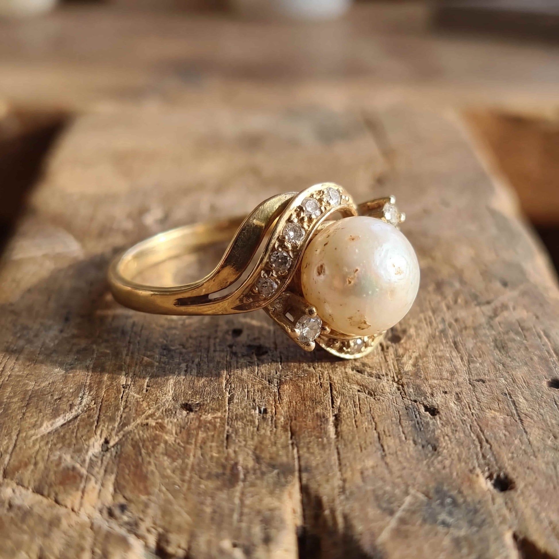 Guldbelagt ring med rund ferskvandsperle og klare miniaturesten.