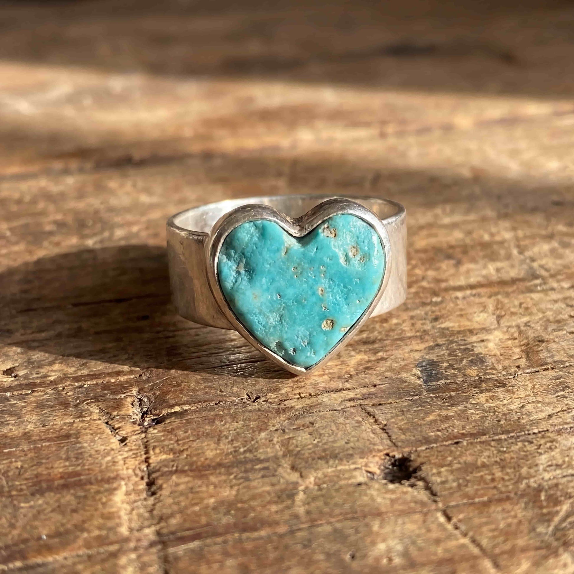 Bred sølvring med turkis hjertesten. Mat sølvbånd med naturlig overflade.